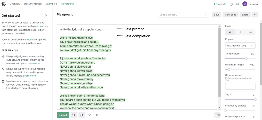 Image: OpenAI Playground showing text prompt and text completion