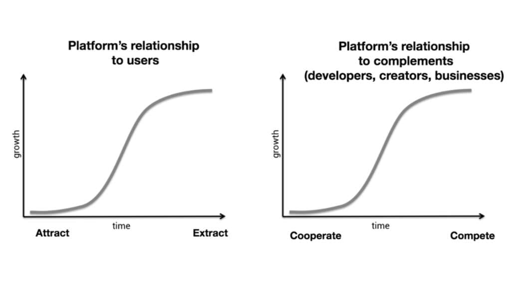 一旦到達「S 型曲線」的頂端,中心化平台與用戶的關係就會從「正和 (Positive-sum)」轉成「零和 (Zero-sum)」。為了繼續擴張,中心化平台通常會透過向用戶以外的第三方,販賣用戶數據以進一步賺取利潤。最廣為人知的例子就是 iOS 和 Android,假如開發人員希望接觸該平台的受眾,在 Apple Store 或 Google Play 商店販售應用程式的話,就必須繳納高達 30% 的利潤抽成。