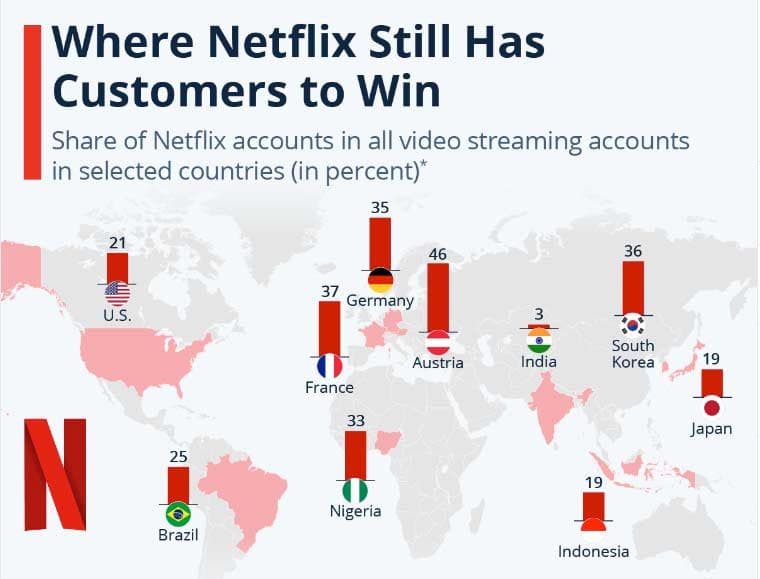 即使如此,Netflix 在傳統歐美市場的用户增長逐漸飽和。為了開拓其他新興市場及照顧其用户需要,Netflix 不斷地將更多的資源投放在如印度、巴西、尼日尼亞等發展中國家。這些國家的特點都是擁有龐大的人口數量並附合 Neflix 追求用户增長數的市場基礎,然而英語通常不是其用户主要的語言。因此,Netflix 致力在這些地區進行本地化製作,包括在影片和劇集中加入本地語言的字幕和配音,以更好地迎合當地觀眾的需求。字幕和配音令這些非英語人口都能夠欣賞 Netflix 自家製的英語影片及劇集,使其製作可以突破地域及語言限制,進一步擴大其全球影響力及市場地位。