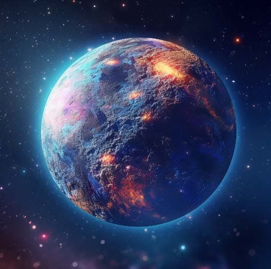 A distant galaxy filled with tiny colorful stars, a blue, Earth-like planet in the foreground, realistic, colorful, 8k, trending on artstation.