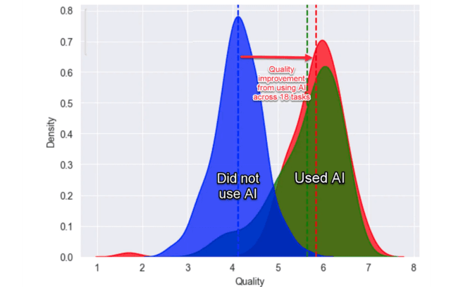 研究人員也注意到一個有趣的現象:那些技術水平最低的諮詢顧問,經過AI工具的輔助後,績效表現的提升幅度高達43%;反觀最優秀的諮詢顧問得到的提升幅度反而很小。