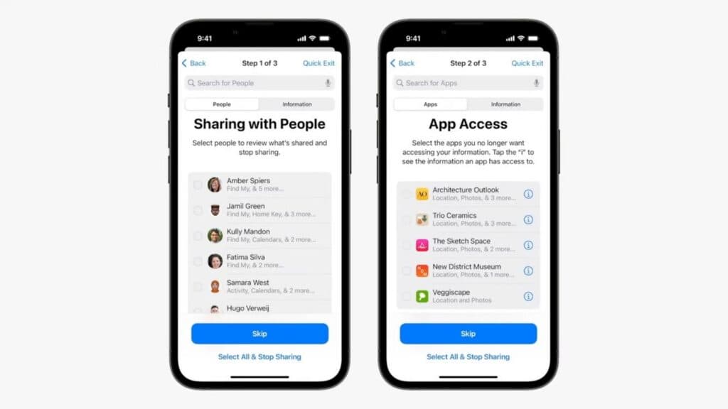 Safety Check幫助用戶管理App訪問權限及密碼,同時亦可通知用戶誰擁有他們的密碼和信息並加以審查和撤銷權限,幫助虐待關係中的人更輕鬆地跨設備切斷與虐待者的聯繫。