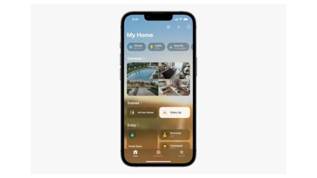 介面更新後,控制、查找設備變得更容易了,Apple亦增加了新類別,燈光、揚聲器和電視、灑水器和水龍頭等關乎安全的設備可以一次過控制。用家現在可以在主頁中看到整個家,新的 HomeKit 鎖屏Widget可幫助用家快速控制配件並查看設備狀態。