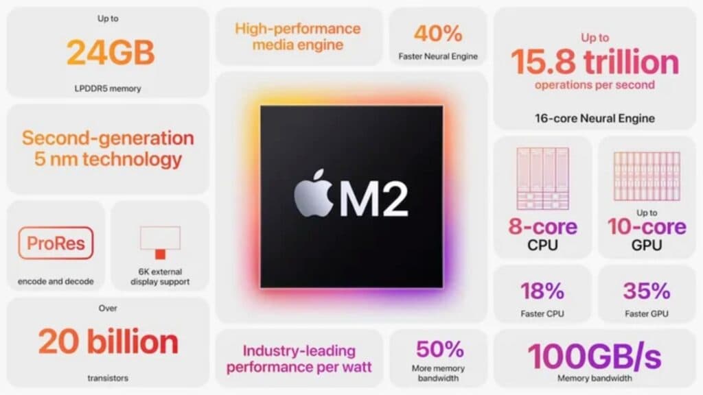 蘋果表示與 M1 相比,新的 M2 處理器性能提升了 18%,同樣使用 Apple 的定制 Arm silicon,擁有 200 億個晶體管,比原來的 M1 多 25%。Apple指「(M2)比最新的 10 核 PC 筆記本電腦芯片快 1.9 倍」。M2支持 8K H.264 和 HEVC 視頻,同時播放多個 4K 和 8K影片沒難度。