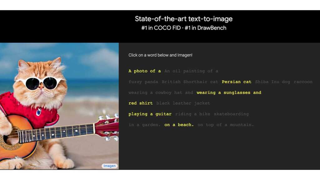 Imagen 是文字生成圖像的擴散模型(Diffusion Model),可以解析用家輸入的文字,深度理解文字意義,然後輸出像相片般的寫實圖像。Imagen 由 Google 旗下深度學習與人工智慧科研專案團隊 Google Brain 負責,建於大型 Transformer 語言模型之上,因此擁有強大的文字理解能力,透過擴散模型便能生成高畫質的圖像。