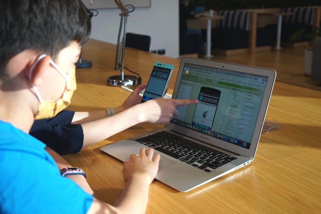 A kid with his instructor was learning to code his app with MIT App Inventor.