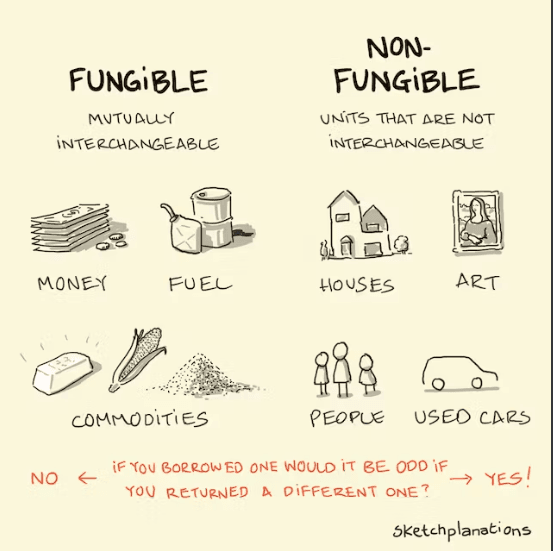 NFT(Non-fungible token),即「非同質化」代幣。非同質化的主要概念為其「不可互換」的性質。可互換性(Fungibility)是當今金融世界中的一個重要的概念。簡單來説,當 A 君 和 B 君互相交換一張 10 港元紙幣,交易後雙方會得到一張同樣價值 10 港元的貨幣。而由於所有的 10 港元紙幣都代表著相同的貨幣價值,貨幣便擁有「可互換性」的性質。除了貨幣外,可互換性的概念同樣可以引申至股票、商品及虛擬貨幣如比特幣。相對而言,由於所有的 NFT 都擁有着獨一無二的性質,亦即每一個獨立的 NFT 在全世界都是唯一的存在,NFT 便擁有「不可互換」的性質,即「非同質化」。非同質化概念亦可以引申至藝術品及房地產。如 A 君所擁有的房屋單位與 B 君的房屋單位都是獨一無二的,即使其貨幣價值可能一致,每一個單位的價值(如地址、損毀程度、樓層等)並不相同,房屋單位因此並不能夠如貨幣一般經交易後雙方依然可以得到同等價值的存在,因此房地產亦擁有非同質化的概念。
