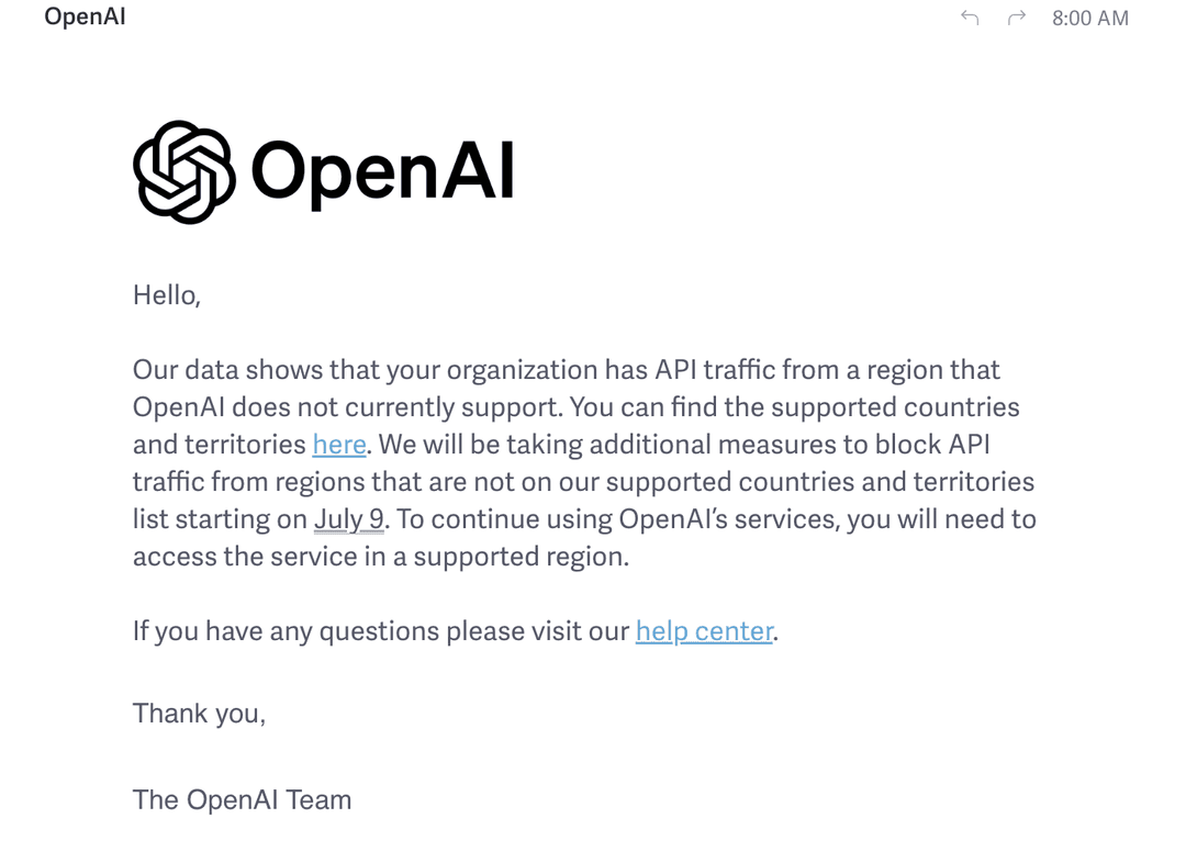 但是,在6月下旬,不少開發者紛紛收到來自 OpenAI 的電郵,提到由7月9日起會封鎖「不支援國家和地區」的 API 使用權,可見今次 OpenAI 的禁令正正針對 API 的使用者或是進階用家。