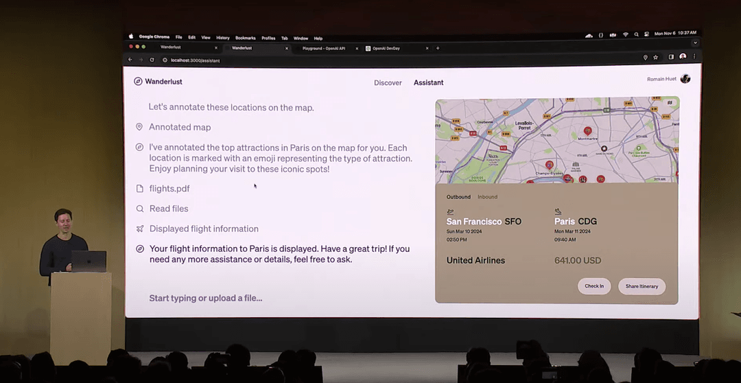 在發佈會上,Assistant API 被整合在一個旅遊網站中,開發人員只需要在 「Assistant Playground」這個 Web UI 中選擇所需的工具及設定,AI 助手便可輕易地被整合至頁面當中,並為網站的用家提供旅遊建議。在發佈片段中,AI 助手通過這些工具使 GPT 和應用程式更暢順地進行互動,並可以識別用家上傳的 PDF 以提出更多的建議。