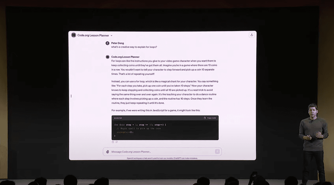 在 DevDay 的使用例子中,GPTs 被自定成為一個供編程教學導師使用的 AI Chatbot,導師可以根據其在教學中遇到的問題輸入 GPTs 中尋求建議,GPTs 便根據教學對象的年齡和身份提供最適合的例子及教學方法。由於 GPTs 在 Chatbot 中會根據用家的需求及應用層面引導用家輸入更多的跟進問題,GPTs 在未來可以提供比初始 ChatGPT 更具個人化的資料搜集及建議,並代替現時各種職業代理上的角色解答專業問題,甚至更進一步改變一般人使用搜尋器的習慣。