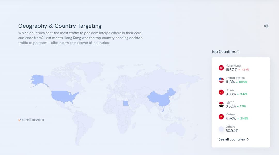 由於ChatGPT不能夠在香港直接訪問,許多香港人都會透過Poe使用ChatGPT,而在2023年6月,香港更是全球最多人使用Poe的地區,佔所有流量的17%。