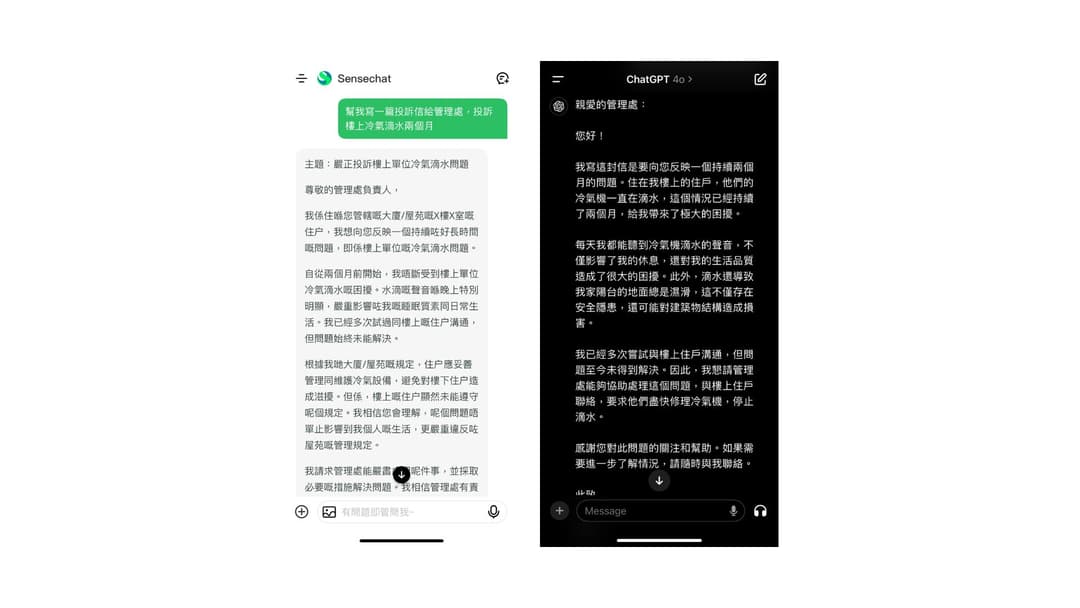 今次我們要求雙方寫一封投訴信投訴樓上冷氣滴水,可見商量的預設回應語言是廣東話,而 GPT-4 則是中文書面語。