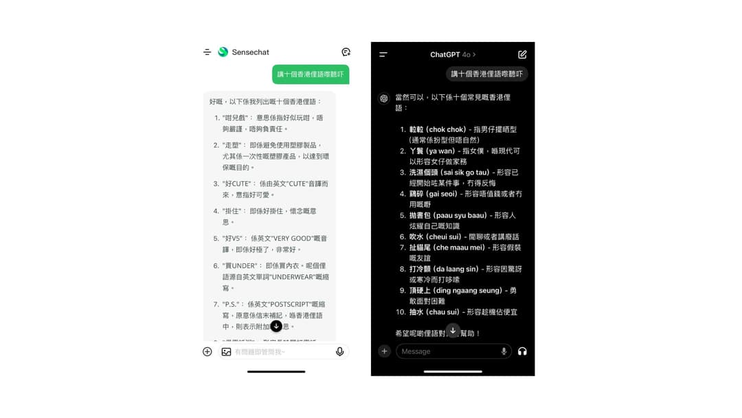我們分別以廣東話詢問商量 及 GPT-4o 生成十個香港俚語,但是兩者均有錯誤,或是意義不明的回應。值得留意的是,商量 AI 雖然以粵語作主打,但是 AI 仍有失誤之處。