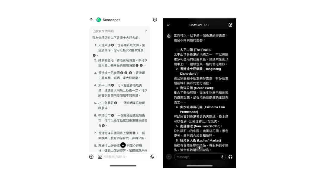 再以「請你推薦十個香港好去處給我」的一句 Prompt 詢問兩者,商量直接連上網絡查詢,提供的資料相對較新而且較為「貼地」;GPT-4o 回答的資料同樣正確,但相對之下較為單調。