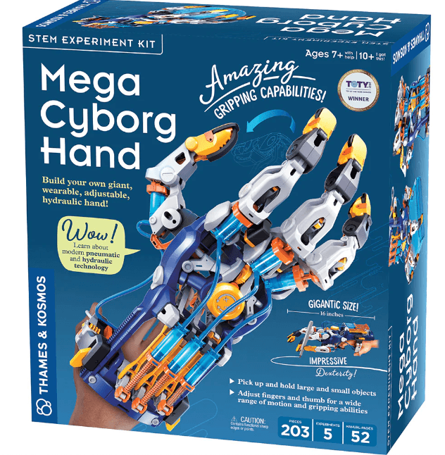 介紹: Thames & Kosmos Mega Cyborg Hand 是一個可穿戴的機械手套,套裝採用氣壓和水的動力而非電機和電池,並通過手指操作來實現機械手的運動。小朋友可以從中了解氣壓和水力系統在工業機器人中的應用,例如汽車零件的運作。該套裝在 2012 年贏得 The Toy Association 的 STEAM Toy Of The Year。