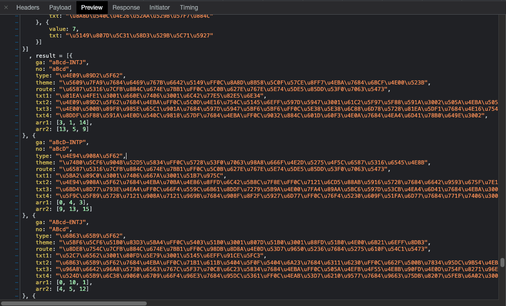 在每段的首句編碼可見一些Developer留下的痕跡,前半「aBcd」亦即是大家在完成測驗後所得出的結果,當然肉眼看是沒有什麼意義的,但因為開發者已預先將問題根據MBTI分類,所以結果可以與MBTI的4個面向作對照。