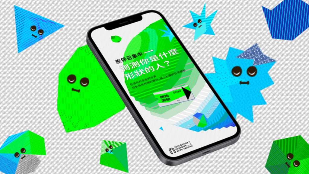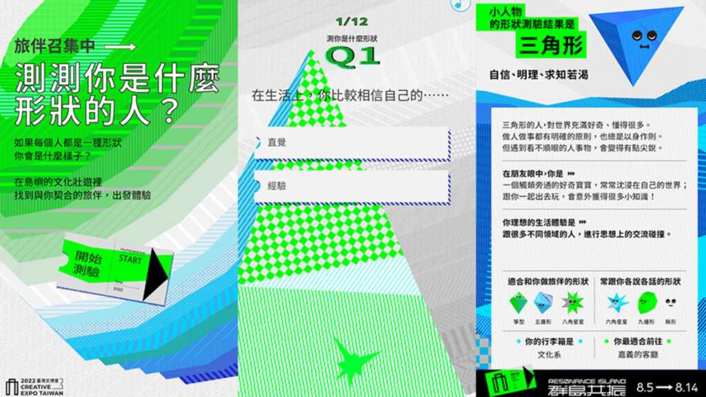 「測測你是什麼形狀的人」只有手機版UI,不過相信很少人會用大螢幕來做心理測驗,而且手機版面非常適合在Instagram、Facebook等社交媒體上分享。每一頁都有視覺設計元素,亦細緻地加上臺灣文博會活動相關資訊。